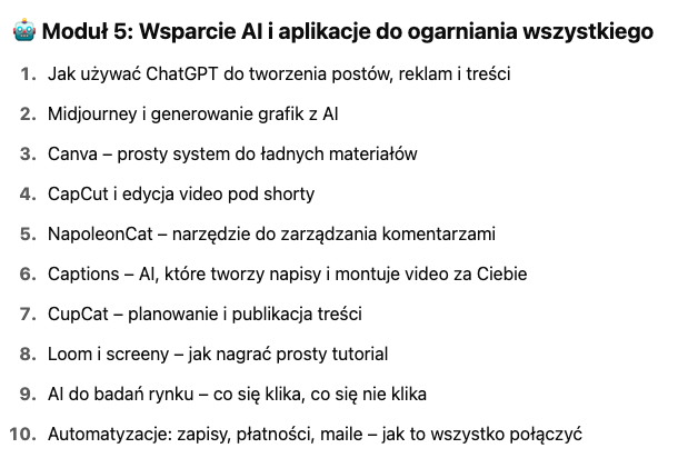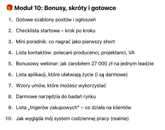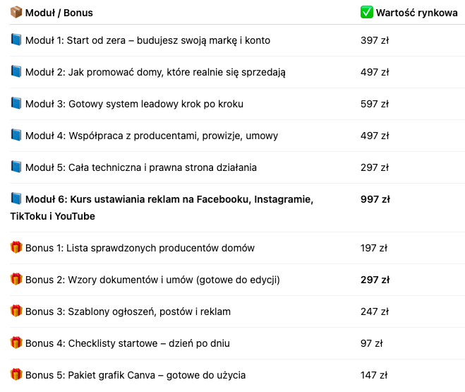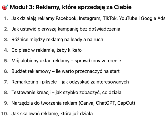 Na start – nie. Z czasem możesz chcieć zainwestować w reklamę (np. 200–300 zł miesięcznie), ale to opcjonalne. Kurs pokazuje także darmowe metody.